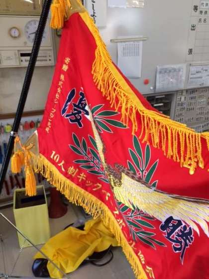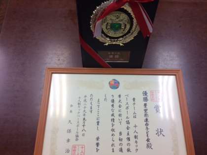 9月18日に行われた「十人制キックベースボール 秋季大会」で、豊里南連合子ども会チームが優勝し、その優勝旗、楯、賞状を伝達しました。