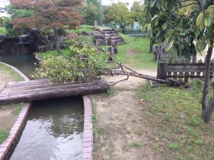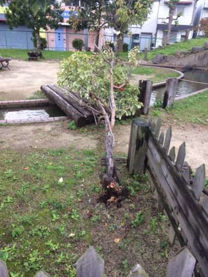 日曜日の台風で、遊び広場のカリンの木が倒れました。
