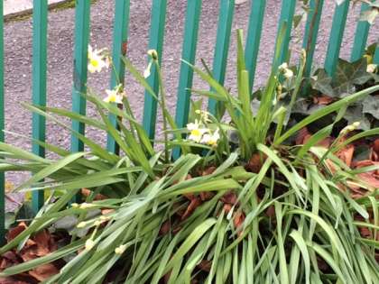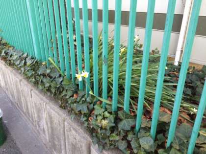 正門の東側、駐輪場と鉄柵の隙間に、スイセンの花が咲いています。