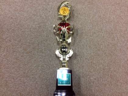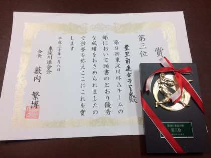 ソフトボールの表彰状・楯とキックベースボールのトロフィーを伝達授与して紹介しました。