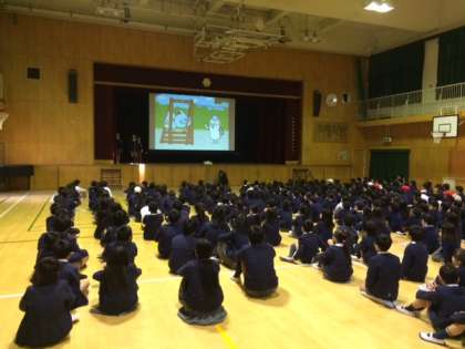 今週は、保健・美化委員会の皆さんが、手洗いの大切さを、絵本で発表してくれました。