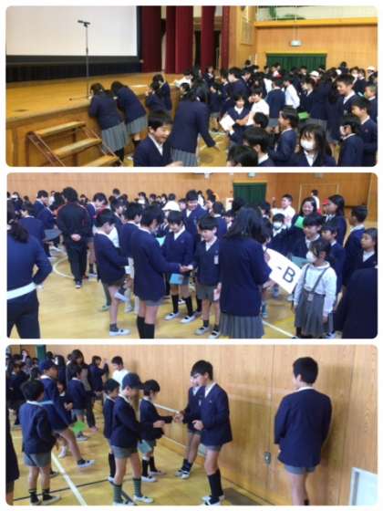 今日は、集会委員会の企画で、「6年生とジャンケンをしてサインをもらう」ゲームをしました。