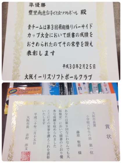 一枚は、子ども会ソフトボールチームの皆さんに、招待試合で準優勝になった賞状。