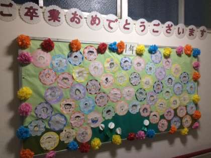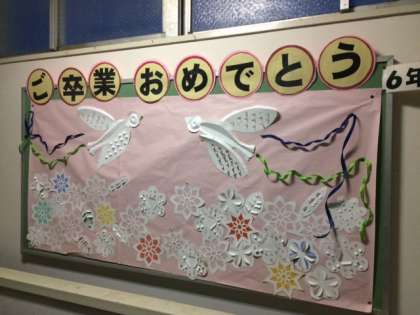 6年生の卒業に向けて、各学年の掲示物もお祝いムード満載です。