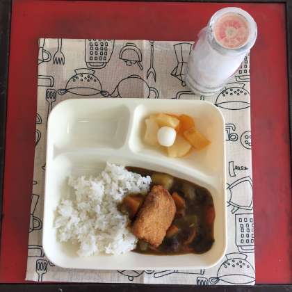今年の入学祝い献立は、カツカレーライス、フルーツ白玉、牛乳でした。