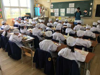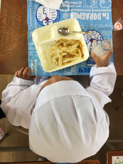 クラスの仲間と食べる給食時間はとても楽しそうです。