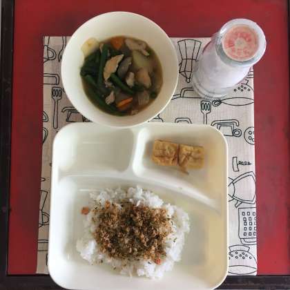 今日の献立は、鶏肉とじゃがいもの煮物、あつあげのしょうゆだれかけ、紅ざけそぼろ、ごはん、牛乳でした。