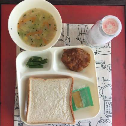 今日の献立は、煮込みハンバーグ、コーンスープ、三度豆のサラダ、食パン、りんごジャム、牛乳でした。
