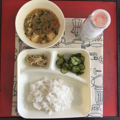 今日の献立は、マーボーどうふ、きゅうりのあまずづけ、もやしとピーマンのごまいため、ごはん、牛乳でした。