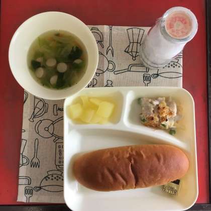 今日の献立は、マカロニグラタン、レタスのスープ、りんご(缶)、コッペパン、バター、牛乳でした。