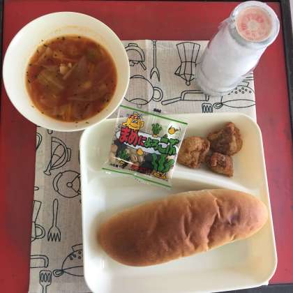 今日の献立は、一口とんかつ、ミネストローネ、まめこんぶ、レーズンパン、牛乳でした。