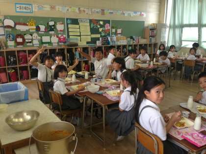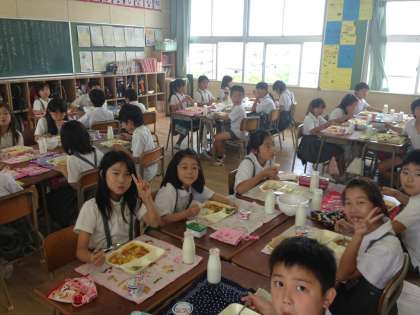 6月3日(火)異学年の子どもたちと交流を深めることをねらいとして交流給食を行いました。1年生は6年生と、2年生は5年生と、3年生は4年生と、クラスの半分が入れ替わって給食を食べました。今日のメニューは、「チキンカレーライス」「キャベツと三度豆のサラダ」「ヨーグルト」でした。子ども達は、いつもとちょっと違った雰囲気の中で楽しそうに給食を食べていました。