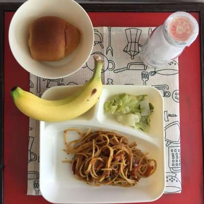 今日の献立は、カレースパゲッティ、キャベツのサラダ、バナナ、1/2黒糖パン、牛乳でした。
