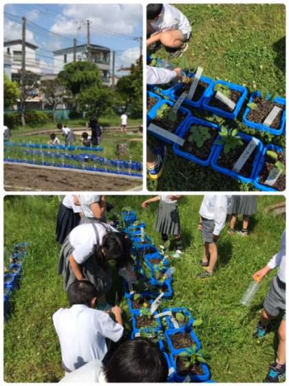 2年生は、学習園で「ミニトマト・キュウリ・オクラ・ピーマン・ナスビ」を育てています。