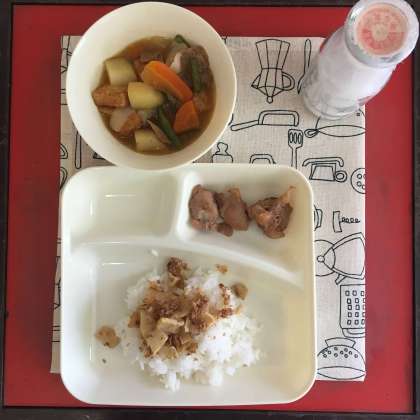 今日の献立は、鶏肉のてり焼き、じゃがいもとあつあげの煮もの、ごまかかいため、ごはん、牛乳でした。
