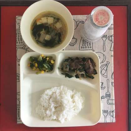 今日の献立は、プルコギ、とうふのスープ、チンゲンサイとコーンの甘酢あえ、ごはん、牛乳でした。
