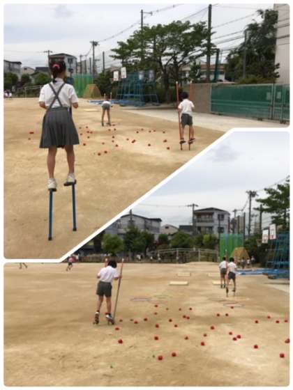 来週の「竹馬大会」にむけて、休み時間には、「竹馬」の練習をしています。