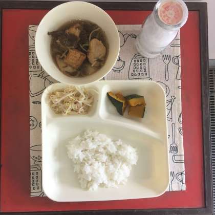 今日の献立は、すき焼き煮、焼きかぼちゃの甘みつかけ、もやしのごま酢あえ、ごはん、牛乳でした。