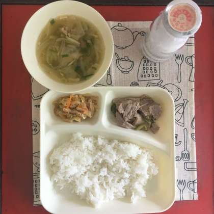 今日の献立は、豚肉の梅風味焼き、すまし汁、切干だいこんのいため煮、ごはん、牛乳でした。