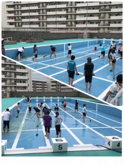 明日の「プール開き」に備えて、先生方みんなでプールをピッカピッカにしました。