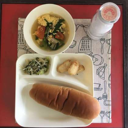 今日の献立は、いかてんぷら、トマトと卵の中華スープ、チンゲンサイともやしのピリ辛あえ、黒糖パン、牛乳でした。