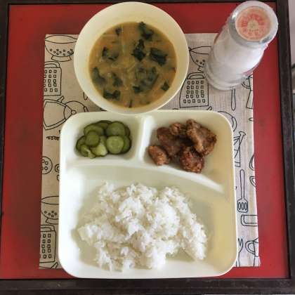 今日の献立は、豚肉の香味揚げ、みそ汁、きゅうりの甘酢づけ、ごはん、牛乳でした。