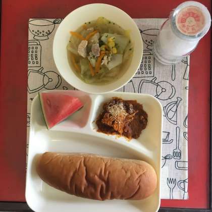 今日の献立は、かぼちゃのミートグラタン、スープ、すいか、黒糖パン、牛乳でした。