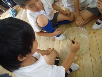 2年生の教室にたくさんのアメリカザリガニが出現しました。ケンカしないように水そうを使って1匹ずつ分けて入れています。赤ちゃんのザリガニもいます。逃げないよう上からアミもかけています。これから生活科の学習や絵のモデルになるそうです。大きなはさみにはさまれないよう気をつけてくださいね。