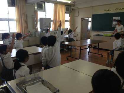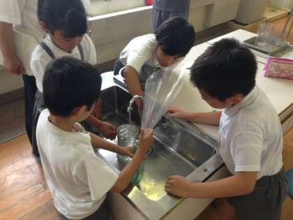 6月26日(木)5時限目に2年1組で算数科の授業が公開されました。単元は「水のかさ」。身近にあるビンやペットボトルなどの容器に入る水の量を予想して、リットルますやデシリットルますを使って実際に測る学習です。子ども達は、自分の予想と実際に入る水のかさが合っているか確かめながら、慎重に水をこぼさないように学習に取り組んでいました。