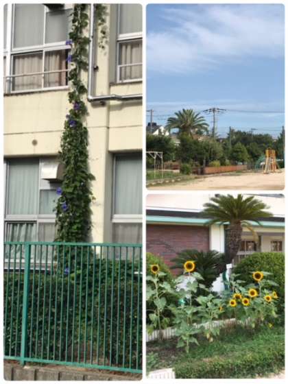 東壁面のアサガオや校庭のヒマワリは、元気に花を咲かせています。
