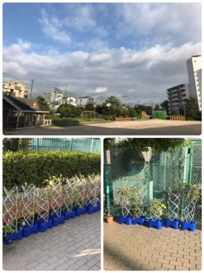 夏休み中に、お家でお世話した1年生のアサガオが学校にもどってきています。