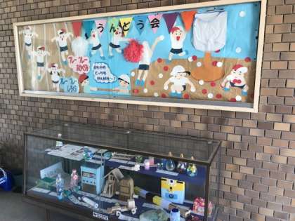 玄関に夏休みの作品が展示されています。