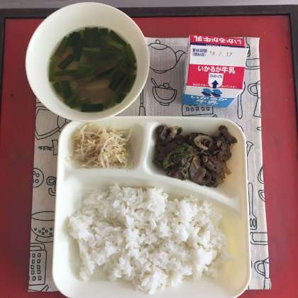 今日の献立は、プルコギ、トック、もやしの甘酢あえ、ごはん、牛乳でした。