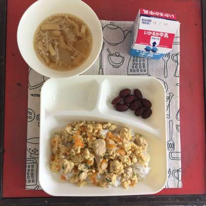 今日の献立は、親子丼、とうがんのすまし汁、金時豆の煮もの、牛乳でした。
