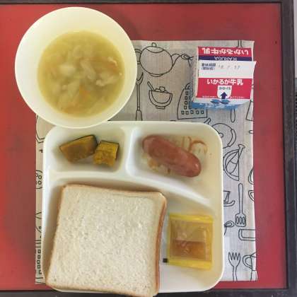 今日の献立は、フランクフルトのケチャップソース、スープ、焼きかぼちゃ、食パン、アプリコットジャム、牛乳でした。