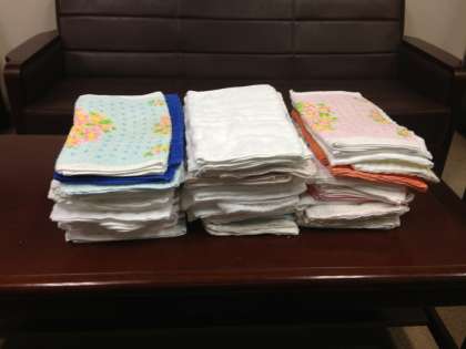 7月8日(火)豊里南地域の敬老会の方から130枚もの手縫いのぞうきんをいただきました。豊里南小学校の子ども達がしっかりそうじをして学校をきれいにしてほしいという願いがこもったものです。月曜日の朝会で紹介した後、各学級に配布しようと思います。敬老会の皆さん本当にありがとうございました。