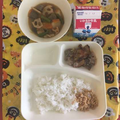 今日の献立は、豚肉のねぎじょうゆ焼き、ふきよせ煮、ツナ大豆そぼろ、ごはん、牛乳でした。