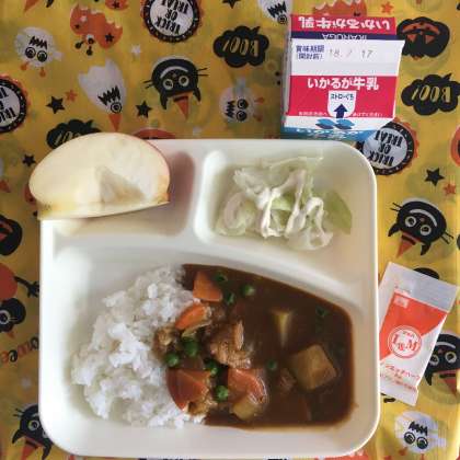今日の献立は、ポークカレーライス[米粉]、キャベツのサラダ[ノンエッグドレッシング]、りんご、牛乳でした。