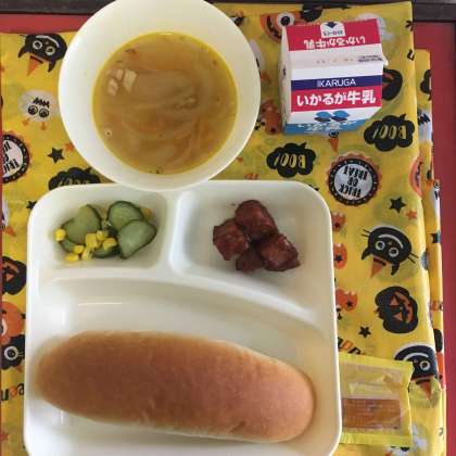 今日の献立は、まぐろのオーロラ煮、スープ、きゅうりとコーンのゆずドレッシング、コッペパン、アプリコットジャム、牛乳でした。