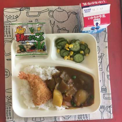 今日の献立は、エビフライカレーライス、きゅうりとコーンのサラダ、まめこんぶ、牛乳でした。