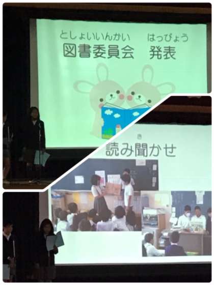 今朝は、図書委員のみなさんが、図書委員会の仕事の紹介とクイズをしてくれました。