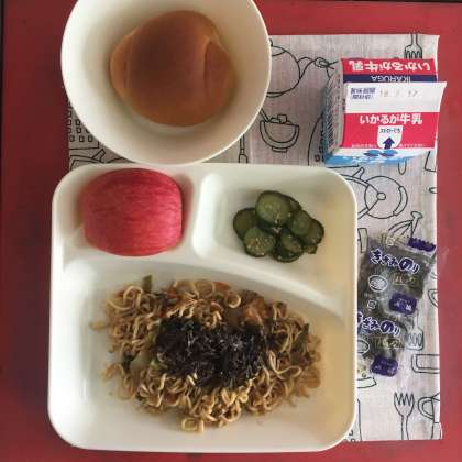 今日の献立は、オイスターソース焼きそば、きゅうりの中華和え、りんご、黒糖パン、牛乳でした。