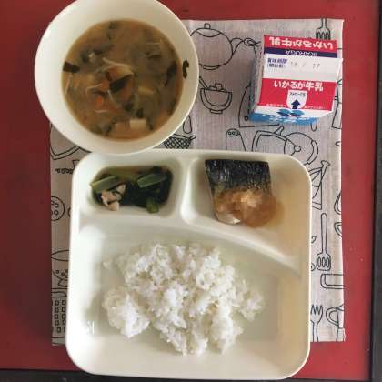 今日の献立は、さばのみぞれかけ、みそ汁、こまつなの煮びたし、ごはん、牛乳でした。