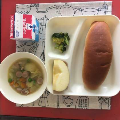 今日の献立は、鶏肉と野菜の洋風煮、ブロッコリーのサラダ、りんご、黒糖パン、牛乳でした。