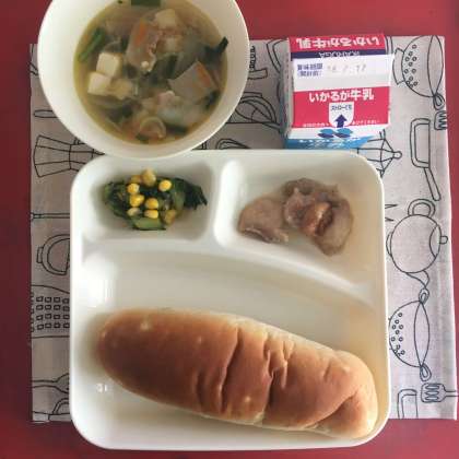 今日の献立は、鶏肉のオイスターソース焼き、糸寒天のスープ、チンゲンサイとコーンの中華あえ、おさつパン、牛乳でした。