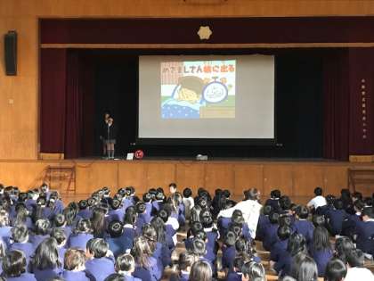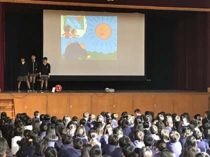 今朝は、保健・美化委員会の皆さんが、絵本の朗読とクイズをしてくれました。