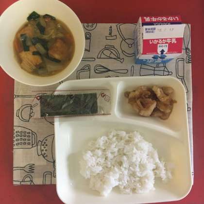 今日の献立は、あげ鶏のねぎソースかけ、あつあげとはくさいの中華煮、焼きのり、ごはん、牛乳でした。