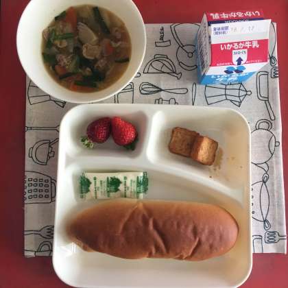 今日の献立は、豚肉とはくさいのうま煮、あつあげのピリ辛じょうゆかけ、いちご、コッペパン、マーガリン、牛乳でした。
