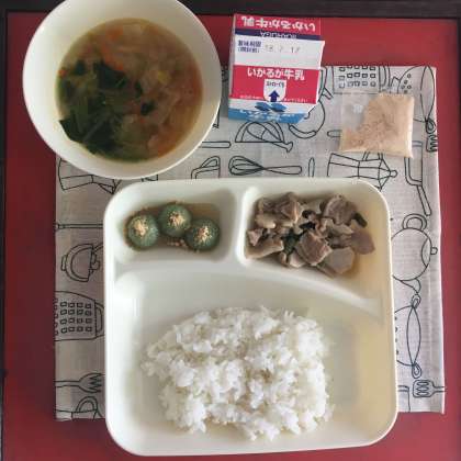 今日の献立は、豚肉とれんこんのいため煮、すまし汁、きなこよもぎだんご、ごはん、牛乳でした。