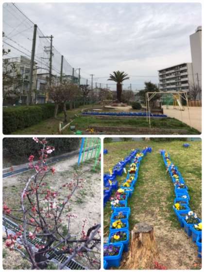 遊び広場の梅の花に代わって、子どもたちの植えた草花が綺麗に咲き始めています。季節の変化を感じます。